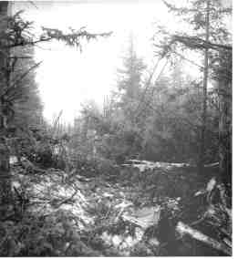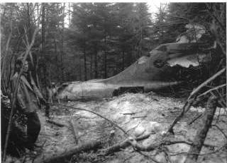These two Bangor Daily News photographs show the crash site on the day of the accident. The aircraft clipped trees for several hundred feet before plowing into the hillside 200 feet from the peak. The photo on the left shows the 100 foot wide swath cut through the trees as the wreckage continued upslope after impact. This is still visible today as a low spot in the trees. The photo on the right shows the rear fuselage where it came to rest near the peak. | |||||||||||||||||